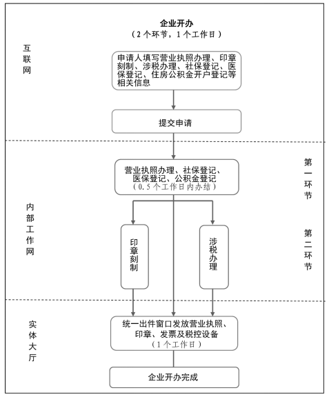 再造企業(yè)開(kāi)辦流程,實(shí)現(xiàn)新開(kāi)辦企業(yè)營(yíng)業(yè)執(zhí)照申領(lǐng)、社保登記、醫(yī)保登記、住房公積金開(kāi)戶(hù)登記、印章刻制、涉稅辦理相關(guān)信息一表填報(bào),同步啟動(dòng)銀行開(kāi)戶(hù)在線(xiàn)預(yù)約;將企業(yè)開(kāi)辦合并為營(yíng)業(yè)執(zhí)照申領(lǐng)、社保登記、醫(yī)保登記、住房公積金登記和印章刻制、涉稅辦理2個(gè)環(huán)節(jié),全程網(wǎng)辦,1個(gè)工作日內(nèi)辦結(jié),辦理結(jié)果及時(shí)反饋;政府免費(fèi)為新開(kāi)辦企業(yè)提供一套印章(公章、財(cái)務(wù)章、發(fā)票專(zhuān)用章、法定代表人名章四枚)、發(fā)票及稅控設(shè)備,并根據(jù)不同類(lèi)型提供相應(yīng)“政策包”。