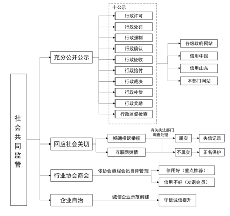 一是依法依規(guī)推動(dòng)信用信息公開(kāi)公示,做到“應(yīng)公開(kāi)、盡公開(kāi)”,從行政許可、行政處罰“雙公示”升級(jí)為行政許可、行政處罰、行政強(qiáng)制、行政確認(rèn)、行政征收、行政給付、行政裁決、行政補(bǔ)償、行政獎(jiǎng)勵(lì)、行政監(jiān)督檢查等“十公示”。二是監(jiān)測(cè)整合12345、12315等各類(lèi)投訴舉報(bào)信息、互聯(lián)網(wǎng)重大輿情監(jiān)測(cè)信息,經(jīng)有關(guān)部門(mén)調(diào)查核實(shí)處理后,納入失信記錄并作為失信信息依法公開(kāi)公示。三是充分發(fā)揮信用服務(wù)機(jī)構(gòu)和行業(yè)協(xié)會(huì)商會(huì)等社會(huì)力量作用,支持其協(xié)助有關(guān)部門(mén)開(kāi)展第三方監(jiān)管。四是廣泛開(kāi)展形式多樣的誠(chéng)信示范企業(yè)創(chuàng)建活動(dòng),引導(dǎo)企業(yè)設(shè)立信用監(jiān)督崗位,加強(qiáng)企業(yè)內(nèi)部誠(chéng)信管理,提升企業(yè)守法誠(chéng)信經(jīng)營(yíng)意識(shí)。