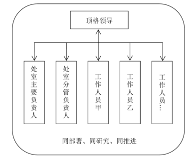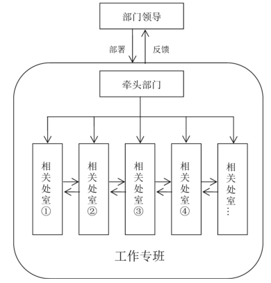 2.建立工作專(zhuān)班制。對(duì)于涉及多個(gè)處室的重要工作,建立相關(guān)處室共同參加的工作專(zhuān)班。部門(mén)主要負(fù)責(zé)同志或分管負(fù)責(zé)同志指定一個(gè)處室牽頭,明確任務(wù)分工,統(tǒng)籌人員力量,實(shí)行“一口對(duì)外”。