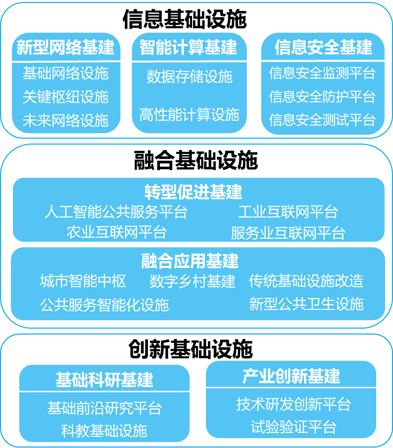 圍繞信息基礎(chǔ)設(shè)施、融合基礎(chǔ)設(shè)施、創(chuàng)新基礎(chǔ)設(shè)施3個方面,突出新型網(wǎng)絡(luò)、智能計算、信息安全、轉(zhuǎn)型促進、融合應(yīng)用、基礎(chǔ)科研、產(chǎn)業(yè)創(chuàng)新7大板塊(以下簡稱7大板塊)重點,強化重大項目的牽引與帶動作用,積極布局5G、數(shù)據(jù)中心、人工智能、物聯(lián)網(wǎng)、工業(yè)互聯(lián)網(wǎng)等新型基礎(chǔ)設(shè)施建設(shè),有序推進數(shù)字設(shè)施化、設(shè)施數(shù)字化進程,為全市經(jīng)濟社會高質(zhì)量發(fā)展注入新動能。到2022年,基本建成以新型網(wǎng)絡(luò)為基礎(chǔ)、智能計算為支撐、信息安全為保障、轉(zhuǎn)型促進為導(dǎo)向、融合應(yīng)用為重點、基礎(chǔ)科研為引領(lǐng)、產(chǎn)業(yè)創(chuàng)新為驅(qū)動的新型基礎(chǔ)設(shè)施體系,基礎(chǔ)設(shè)施泛在通用、智能協(xié)同、開放共享水平全面提升,打造全國領(lǐng)先的新一代信息基礎(chǔ)支持體系,筑牢超大城市智慧治理底座、高質(zhì)量發(fā)展基石。