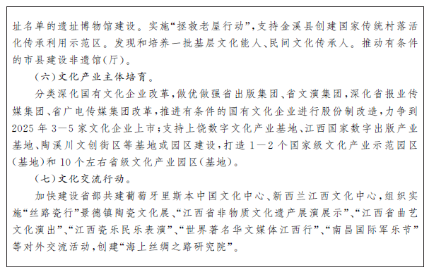 高標(biāo)準(zhǔn)建設(shè)景德鎮(zhèn)國家陶瓷文化傳承創(chuàng)新試驗區(qū),努力打造“兩地一中心”兩地一中心:國家陶瓷文化保護(hù)傳承創(chuàng)新基地、世界著名陶瓷文化旅游目的地、國際陶瓷文化交流合作交易中心。。全面推進(jìn)南昌漢代海昏侯國遺址、景德鎮(zhèn)御窯廠遺址等國家考古遺址公園建設(shè),構(gòu)建更具江西特色的考古遺址公園體系和遺址博物館群。深入開展江西歷史文化專題研究闡釋,推進(jìn)書院文化、稻作文化、戲曲文化、中醫(yī)藥文化、陽明文化等特色歷史文化傳承創(chuàng)新,推動婺源徽州文化、贛南客家文化、景德鎮(zhèn)陶瓷文化、吉安廬陵文化、撫州戲曲文化等文化生態(tài)保護(hù)區(qū)(實驗區(qū))建設(shè)。加強(qiáng)世界文化遺產(chǎn)、重點文物保護(hù)單位、歷史文化名城名鎮(zhèn)名村、傳統(tǒng)村落保護(hù)和利用。強(qiáng)化非物質(zhì)文化遺產(chǎn)系統(tǒng)性保護(hù)。加強(qiáng)優(yōu)秀傳統(tǒng)手工藝保護(hù)和傳承。開展贛鄱文化資源普查,深化古籍整理研究。加強(qiáng)地方志工作。啟動《江右文庫》編纂工程。