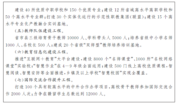 推進(jìn)高等教育分類管理和高等學(xué)校綜合改革,推動高等教育由數(shù)量規(guī)模型向內(nèi)涵質(zhì)量型轉(zhuǎn)變,全面提升人才培養(yǎng)質(zhì)量和科技創(chuàng)新能力。持續(xù)推進(jìn)高等學(xué)校“雙一流”建設(shè),舉全省之力辦好南昌大學(xué),爭取進(jìn)入世界一流大學(xué)建設(shè)高校行列。支持更多特色高校建設(shè)世界一流學(xué)科。優(yōu)化高等教育布局,主動融入國家重大戰(zhàn)略和全省發(fā)展需求,創(chuàng)建若干應(yīng)用型本科院校,引導(dǎo)部分省屬本科院校轉(zhuǎn)型建設(shè)高水平應(yīng)用型高校,加快培養(yǎng)理工農(nóng)醫(yī)類專業(yè)緊缺人才。深化高校省部共建體制機(jī)制,加大力度吸引國內(nèi)外知名高校在江西開展合作辦學(xué),爭取更多支持,豐富辦學(xué)資源,擴(kuò)大教育供給。穩(wěn)步擴(kuò)大研究生培養(yǎng)規(guī)模,深化研究生教育改革,提升高層次人才培養(yǎng)質(zhì)量。擴(kuò)大學(xué)校辦學(xué)自主權(quán),推進(jìn)高校建立以章程為核心的制度體系。