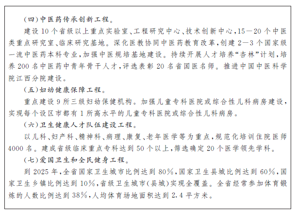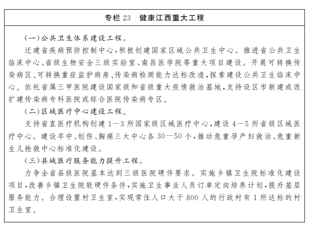 推動優(yōu)質(zhì)醫(yī)療資源擴(kuò)容和區(qū)域均衡布局,積極創(chuàng)建國家區(qū)域醫(yī)療中心,建設(shè)一批省級區(qū)域醫(yī)療中心,整合推進(jìn)卒中、創(chuàng)傷、胸痛、危重孕產(chǎn)婦、危重新生兒救治中心等急危重癥救治體系建設(shè)。以城市社區(qū)和農(nóng)村基層、縣級醫(yī)院和中醫(yī)院為重點,完善城鄉(xiāng)三級醫(yī)療服務(wù)網(wǎng)絡(luò),促進(jìn)“縣鄉(xiāng)一體、鄉(xiāng)村一體”。持續(xù)推進(jìn)省市縣三級公立中醫(yī)院改造升級和基層中醫(yī)藥服務(wù)全覆蓋。加強(qiáng)全科、兒科、麻醉、精神衛(wèi)生、康復(fù)管理、心理健康等急需緊缺專業(yè)人才和公共衛(wèi)生復(fù)合型人才培養(yǎng)培訓(xùn),培養(yǎng)仁心仁術(shù)的醫(yī)學(xué)人才。落實鄉(xiāng)村醫(yī)生待遇,加強(qiáng)基層人才隊伍建設(shè)。加快“互聯(lián)網(wǎng)+醫(yī)療健康”發(fā)展,建成覆蓋省市縣鄉(xiāng)四級醫(yī)療衛(wèi)生機(jī)構(gòu)的遠(yuǎn)程醫(yī)療服務(wù)體系。大力推行醫(yī)療機(jī)構(gòu)檢查、檢驗結(jié)果互認(rèn),規(guī)范醫(yī)療質(zhì)量控制管理,改善患者就醫(yī)體驗。
