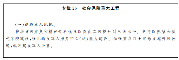 推動養(yǎng)老事業(yè)和養(yǎng)老產(chǎn)業(yè)協(xié)同發(fā)展,發(fā)展普惠型養(yǎng)老服務(wù)和互助性養(yǎng)老,支持家庭承擔(dān)養(yǎng)老功能,構(gòu)建居家社區(qū)機(jī)構(gòu)相協(xié)調(diào)、醫(yī)養(yǎng)康養(yǎng)相結(jié)合的養(yǎng)老服務(wù)體系。健全基本養(yǎng)老服務(wù)體系,夯實公辦養(yǎng)老院的兜底功能,深化公辦養(yǎng)老機(jī)構(gòu)改革,完善公建民營管理機(jī)制,支持具有教育培訓(xùn)或療養(yǎng)休養(yǎng)功能的機(jī)構(gòu)轉(zhuǎn)型發(fā)展養(yǎng)老服務(wù),加強(qiáng)對護(hù)理型、連鎖型民辦養(yǎng)老機(jī)構(gòu)的政策扶持。推進(jìn)公共基礎(chǔ)設(shè)施適老化改造,支持和規(guī)范專業(yè)化機(jī)構(gòu)服務(wù)向社區(qū)延伸,大力發(fā)展社區(qū)嵌入式養(yǎng)老,探索社區(qū)“物業(yè)+養(yǎng)老服務(wù)”模式。深入推進(jìn)醫(yī)養(yǎng)結(jié)合,擴(kuò)大養(yǎng)老機(jī)構(gòu)護(hù)理型床位供給。推廣“黨建+農(nóng)村養(yǎng)老服務(wù)”模式,健全覆蓋縣鄉(xiāng)村三級的農(nóng)村養(yǎng)老服務(wù)體系。加快推進(jìn)公辦養(yǎng)老機(jī)構(gòu)入住綜合評估和輪候制度,健全養(yǎng)老服務(wù)綜合監(jiān)管制度。強(qiáng)化老年人權(quán)益保障,提升老年人社會優(yōu)待水平。