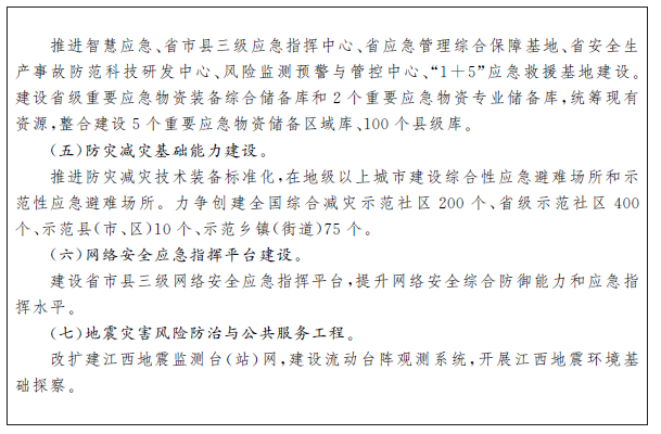 健全完善安全生產(chǎn)責(zé)任和管理制度,加快建立公共安全風(fēng)險排查和隱患治理體系。強(qiáng)化企業(yè)主體責(zé)任落實,加強(qiáng)危險化學(xué)品、煙花爆竹、礦山、建筑施工、交通、消防等重點領(lǐng)域安全生產(chǎn)監(jiān)管執(zhí)法,有效遏制重特大公共安全事故。強(qiáng)化生物安全保障,提高食品藥品等關(guān)系人民健康產(chǎn)品和服務(wù)的安全監(jiān)管水平,強(qiáng)化疫苗等高風(fēng)險品種監(jiān)管。建立高效科學(xué)的自然災(zāi)害防治體系,提升洪澇干旱、森林火災(zāi)、地質(zhì)災(zāi)害、氣象災(zāi)害、地震等自然災(zāi)害防御工程標(biāo)準(zhǔn),推進(jìn)防災(zāi)抗災(zāi)重大基礎(chǔ)設(shè)施建設(shè)。完善應(yīng)急管理體制機(jī)制,強(qiáng)化應(yīng)急管理基礎(chǔ)和應(yīng)急救援隊伍建設(shè)。加快構(gòu)建政府、企業(yè)、第三方等多方聯(lián)動的應(yīng)急物資保障體系,合理確定省級儲備和市縣級儲備、政府儲備和企業(yè)儲備、實物儲備和產(chǎn)能儲備規(guī)模,完善物資儲備、動用應(yīng)急預(yù)案。發(fā)展巨災(zāi)保險。