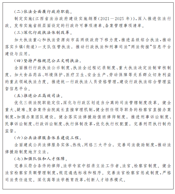 深入貫徹習(xí)近平法治思想,堅持依法治省、依法執(zhí)政、依法行政共同推進(jìn),法治江西、法治政府、法治社會一體建設(shè),健全完善黨內(nèi)法規(guī),全面推進(jìn)科學(xué)立法、嚴(yán)格執(zhí)法、公正司法、全民守法。