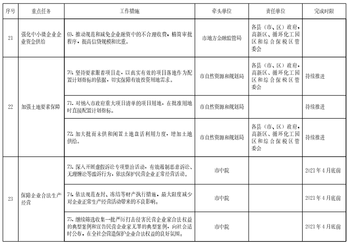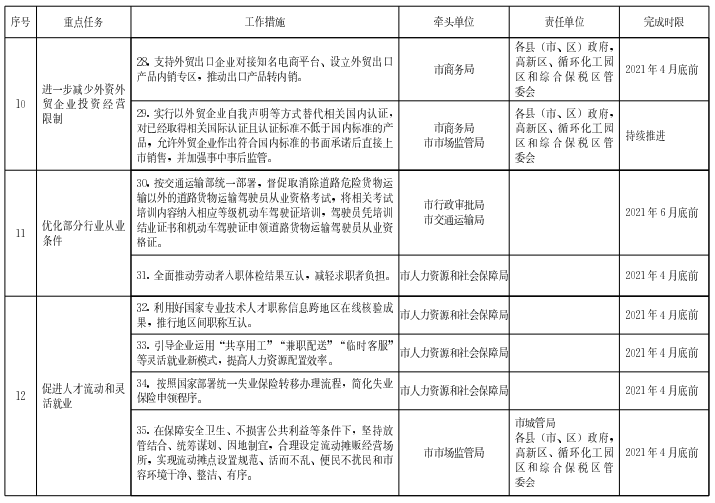 ?。ㄎ澹┻M(jìn)一步降低市場(chǎng)準(zhǔn)入門(mén)檻。做好《市場(chǎng)準(zhǔn)入負(fù)面清單(2020年版)》實(shí)施工作,嚴(yán)格落實(shí)“一張清單”管理模式,確?!耙粏伪M列、單外無(wú)單”。圍繞工程建設(shè)、教育、醫(yī)療、體育等領(lǐng)域開(kāi)展集中清理,清除市有關(guān)部門(mén)和各市在市場(chǎng)準(zhǔn)入方面對(duì)企業(yè)資質(zhì)、資金、股比、人員、場(chǎng)所等設(shè)置的不合理?xiàng)l件,列出臺(tái)賬并逐項(xiàng)明確解決措施、責(zé)任主體和完成時(shí)限。加強(qiáng)診所設(shè)置執(zhí)業(yè)管理,在自貿(mào)試驗(yàn)區(qū)對(duì)診所設(shè)置、診所執(zhí)業(yè)實(shí)行備案管理試點(diǎn),條件成熟后在全市推廣。