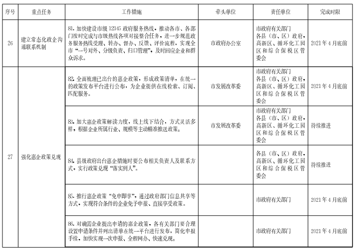 ?。ǘ撸?qiáng)化惠企政策兌現(xiàn)。全面梳理已出臺(tái)的惠企政策,形成政策清單,在統(tǒng)一的政策發(fā)布平臺(tái)進(jìn)行公布,為企業(yè)提供在線檢索、訂閱、匹配服務(wù)。加大惠企政策解讀力度,線上線下結(jié)合,方式靈活多樣,根據(jù)企業(yè)所屬行業(yè)、規(guī)模等主動(dòng)精準(zhǔn)推送政策??h級(jí)政府出臺(tái)惠企措施時(shí)要公布相關(guān)負(fù)責(zé)人及聯(lián)系方式,實(shí)行政策兌現(xiàn)“落實(shí)到人”。推行惠企政策“免申即享”,通過(guò)政府部門(mén)信息共享等方式,實(shí)現(xiàn)符合條件的企業(yè)免予申報(bào)、直接享受政策。對(duì)確需企業(yè)提出申請(qǐng)的惠企政策,各有關(guān)部門(mén)要合理設(shè)置申請(qǐng)條件并列出清單在統(tǒng)一平臺(tái)進(jìn)行發(fā)布,簡(jiǎn)化申報(bào)手續(xù),加快實(shí)現(xiàn)一次申報(bào)、全程網(wǎng)辦、快速兌現(xiàn)。