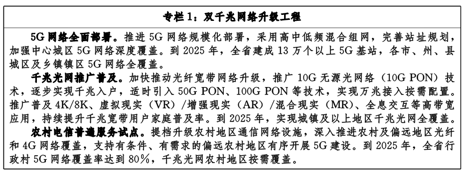 ——信息基礎(chǔ)設(shè)施達(dá)到全國一流。構(gòu)建起“萬物互聯(lián)、數(shù)智融合、技術(shù)引領(lǐng)”的信息基礎(chǔ)設(shè)施體系,網(wǎng)絡(luò)設(shè)施、算力設(shè)施發(fā)展中部領(lǐng)先,建成一批通用人工智能、區(qū)塊鏈公共服務(wù)平臺。5G基站達(dá)到13萬個,行政村5G網(wǎng)絡(luò)通達(dá)比例達(dá)到80%,千兆寬帶接入端口占比達(dá)到80%,數(shù)據(jù)中心標(biāo)準(zhǔn)機架數(shù)達(dá)到25萬個,區(qū)塊鏈網(wǎng)絡(luò)節(jié)點數(shù)達(dá)到20個。