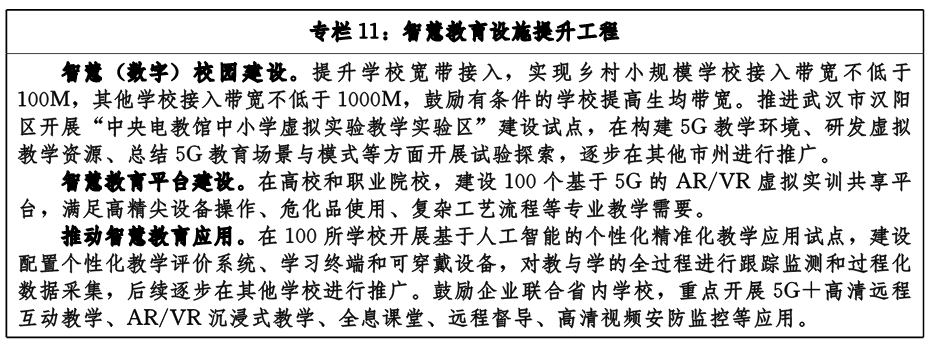 推進(jìn)智慧校園建設(shè)。加快建設(shè)在線智能教室、智能實驗室、虛擬工廠、數(shù)字圖書館等智能學(xué)習(xí)空間,形成泛在化、智能化學(xué)習(xí)體系。推進(jìn)創(chuàng)客教室、虛擬仿真實驗室、綜合教育教室等智能化教學(xué)環(huán)境建設(shè)。優(yōu)化升級學(xué)校網(wǎng)絡(luò)接入和帶寬條件,推動5G網(wǎng)絡(luò)覆蓋校園,實現(xiàn)全省各級各類學(xué)校數(shù)字校園全覆蓋。開展智慧教育試點示范,探索基于人工智能的教育教學(xué)和教育管理模式,重點推進(jìn)武漢市創(chuàng)建國家智慧教育示范區(qū)。