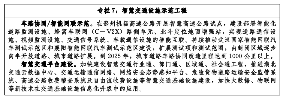 推動城市道路、高速公路和鐵路智能化升級。推動5G、物聯(lián)網(wǎng)、BIM、GIS、北斗等先進(jìn)信息技術(shù)在城市道路規(guī)劃、設(shè)計、建造及養(yǎng)護(hù)過程中的應(yīng)用,感知網(wǎng)絡(luò)與道路同步規(guī)劃、同步建設(shè),加快城市道路數(shù)字化、網(wǎng)絡(luò)化和智能化改造,發(fā)展車路協(xié)同和自動駕駛。加快建設(shè)“九縱五橫四環(huán)”高速公路網(wǎng),整合行業(yè)主管部門、高速交警、經(jīng)營單位等已有高速公路信息基礎(chǔ)設(shè)施,提升已建高速公路智能化水平,深化高速公路電子不停車收費系統(tǒng)(ETC)拓展應(yīng)用。在鄂州花湖機場高速公路等項目試點建設(shè)車路協(xié)同基礎(chǔ)設(shè)施,實現(xiàn)全天候、多要素的交通狀態(tài)感知和交互,豐富車路協(xié)同應(yīng)用場景。大力發(fā)展高速鐵路和城市軌道交通,加快建設(shè)“米字型、十通向”高鐵樞紐網(wǎng),有序推進(jìn)襄陽、宜昌市城市軌道交通發(fā)展,運用大數(shù)據(jù)、人工智能等信息技術(shù)提升鐵路建設(shè)、監(jiān)測及管理等方面智能化水平。