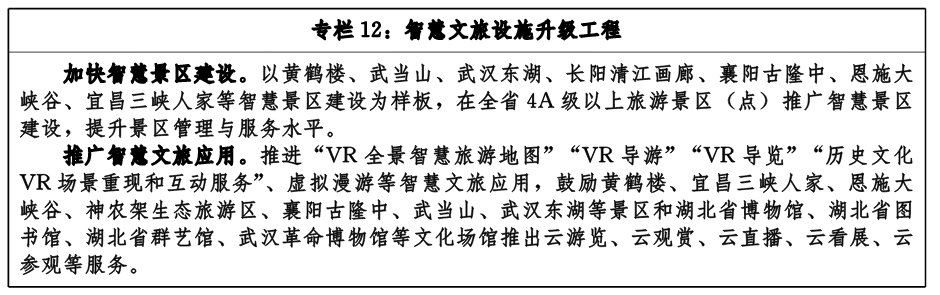 推進(jìn)智慧景區(qū)建設(shè)。全省4A級以上旅游景區(qū)(點)深入推進(jìn)“智慧景區(qū)”建設(shè),建設(shè)完善景區(qū)預(yù)約服務(wù)平臺、視頻監(jiān)控系統(tǒng)、電子票務(wù)系統(tǒng)、智慧停車系統(tǒng)、流量監(jiān)測系統(tǒng)、景區(qū)數(shù)據(jù)資料應(yīng)用平臺、應(yīng)急管理平臺、一鍵報警系統(tǒng)和景區(qū)智能調(diào)度應(yīng)用平臺等,提升旅游服務(wù)體驗。加快5G網(wǎng)絡(luò)在景區(qū)、景區(qū)道路覆蓋。結(jié)合5G、大數(shù)據(jù)、人工智能、AR/VR等技術(shù),率先在武漢、襄陽、宜昌、咸寧、十堰、黃岡、恩施、神農(nóng)架等地建成一批數(shù)字虛擬景區(qū),豐富虛擬旅游內(nèi)容層次,立體展現(xiàn)湖北自然風(fēng)貌、人文歷史、風(fēng)土民情等特色。支持旅游景區(qū)利用網(wǎng)絡(luò)直播、AR/VR等開展線上旅游,引導(dǎo)在線旅游企業(yè)開發(fā)更多符合市場需求的網(wǎng)絡(luò)旅游套餐。