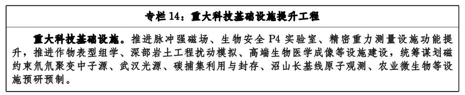 推進(jìn)脈沖強磁場、作物表型組學(xué)、深部巖土工程擾動模擬、精密重力測量、生物安全P4實驗室、高端生物醫(yī)學(xué)成像等6個重大科技基礎(chǔ)設(shè)施優(yōu)化提升或加快建設(shè),統(tǒng)籌謀劃磁約束氘氘聚變中子源、武漢光源、農(nóng)業(yè)微生物、碳捕集利用與封存、沼山長基線原子觀測等重大科技基礎(chǔ)設(shè)施預(yù)研預(yù)制。