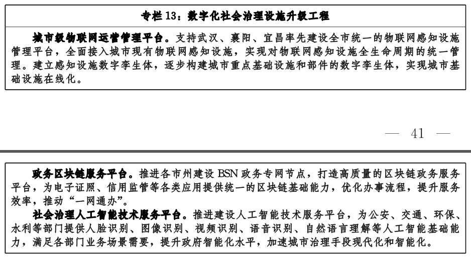 推進(jìn)共性支撐能力建設(shè)。完善統(tǒng)一身份認(rèn)證系統(tǒng)、電子印章系統(tǒng)、電子證照系統(tǒng)、網(wǎng)上支付系統(tǒng),探索建設(shè)區(qū)塊鏈政務(wù)服務(wù)平臺、政務(wù)AI算法平臺。完善省、市兩級國土空間基礎(chǔ)信息平臺,構(gòu)建湖北省時空大數(shù)據(jù)平臺,推動各市州統(tǒng)一建設(shè)開放共享的智慧城市時空大數(shù)據(jù)平臺和三維地理信息系統(tǒng)平臺。推動各市州建設(shè)統(tǒng)一的城市級物聯(lián)網(wǎng)感知設(shè)施管理平臺,實現(xiàn)城市基礎(chǔ)部件、感知設(shè)施全生命周期的統(tǒng)一接入、協(xié)同調(diào)度和數(shù)據(jù)匯集。積極推進(jìn)城市級BIM管理平臺建設(shè),統(tǒng)籌構(gòu)建CIM基礎(chǔ)平臺,積極推進(jìn)城市級CIM平臺建設(shè),以武漢市東湖新技術(shù)開發(fā)區(qū)部分區(qū)域為試點探索建設(shè)數(shù)字孿生城市。