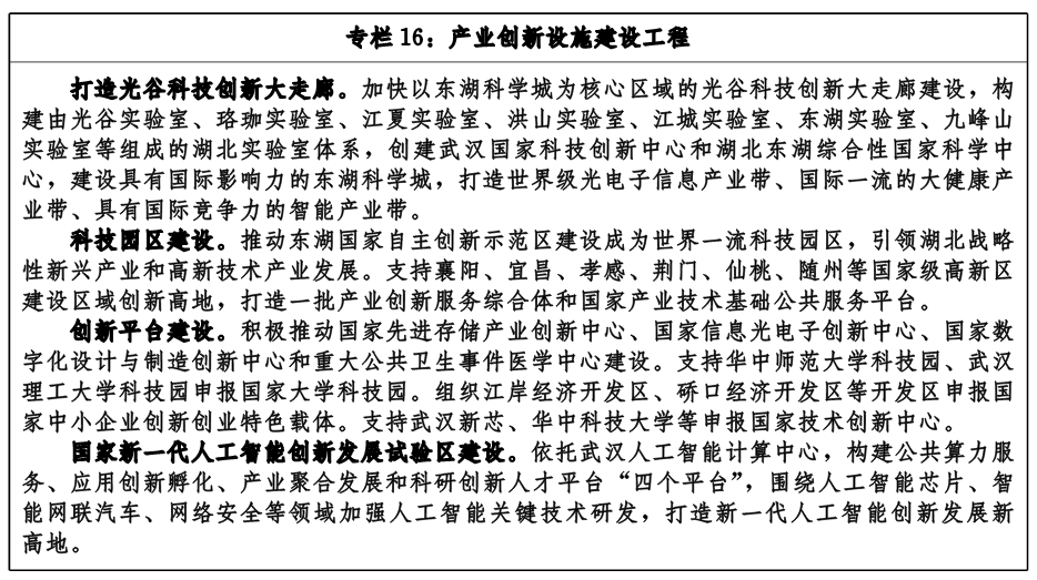 以提升科技和產(chǎn)業(yè)創(chuàng)新平臺能級為導(dǎo)向,加快以東湖科學(xué)城為核心區(qū)域的光谷科技創(chuàng)新大走廊建設(shè),構(gòu)建由光谷實驗室、珞珈實驗室、江夏實驗室、洪山實驗室、江城實驗室、東湖實驗室、九峰山實驗室等組成的湖北實驗室體系,創(chuàng)建武漢國家科技創(chuàng)新中心和湖北東湖綜合性國家科學(xué)中心,構(gòu)建國內(nèi)領(lǐng)先的創(chuàng)新基礎(chǔ)設(shè)施。