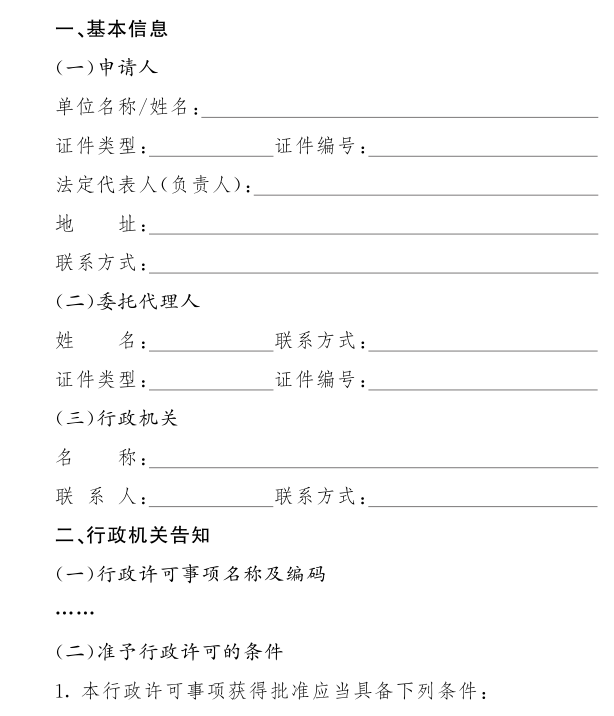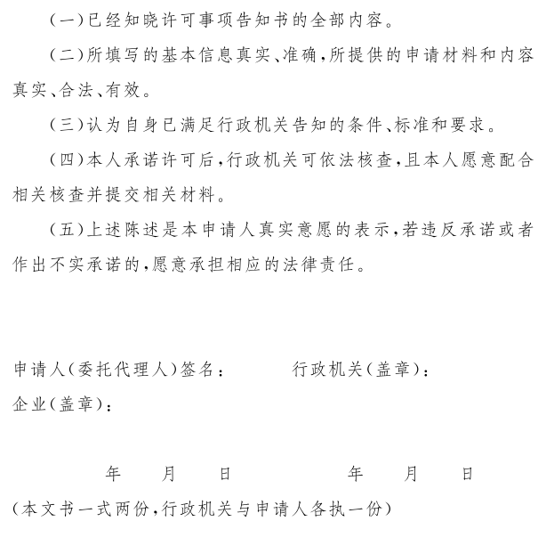 (三)制定具體工作規(guī)程。省直有關(guān)部門要會同市縣相關(guān)部門按照全面準(zhǔn)確、權(quán)責(zé)清晰的要求,對本系統(tǒng)內(nèi)實(shí)行告知承諾制的涉企經(jīng)營許可事項,逐項編制告知承諾具體工作規(guī)程,明確實(shí)行告知承諾制的許可條件、許可材料、證明事項,制作告知承諾書格式文本(附件2),科學(xué)制定核查機(jī)制和監(jiān)管措施。行政機(jī)關(guān)應(yīng)當(dāng)按照精簡、明確、便利的要求,修訂完善辦事指南,在辦事指南中依法準(zhǔn)確列出辦理實(shí)行告知承諾制的涉企經(jīng)營許可事項的許可條件、需要提交的材料、可以減省的材料等,不得含有如“法律法規(guī)規(guī)定的其他條件”“政府部門認(rèn)為必要的其他條件”之類的兜底性條款。告知承諾制辦事指南、告知承諾書格式文本要通過辦事大廳、門戶網(wǎng)站和江西一體化政務(wù)服務(wù)平臺等渠道公布,方便申請人查閱、索取及下載。對因企業(yè)承諾可以減省的審批材料,不再要求企業(yè)當(dāng)場提供;對可在企業(yè)領(lǐng)證之后補(bǔ)交的審批材料,實(shí)行容缺受理、限期補(bǔ)交。能夠提供電子證照的,原則上免于提交實(shí)體證照。