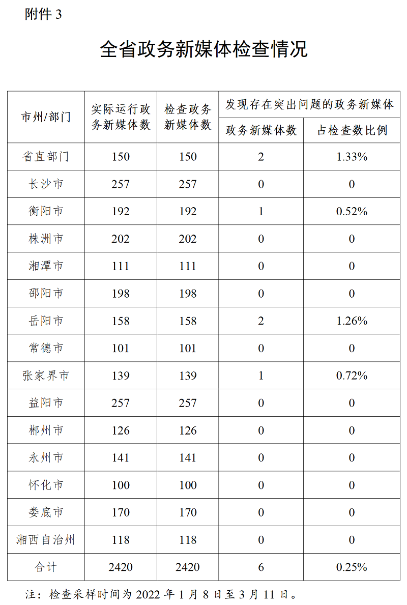 對此次通報的政府網(wǎng)站和政務新媒體存在問題,各地各部門要高度重視,舉一反三做好整改。各單位問題整改情況請于2022年4月15日前書面反饋省政務局,省政務局將對整改情況進行復核。(聯(lián)系人:鄭鏘,聯(lián)系電話兼?zhèn)髡妫?731—89990430)
