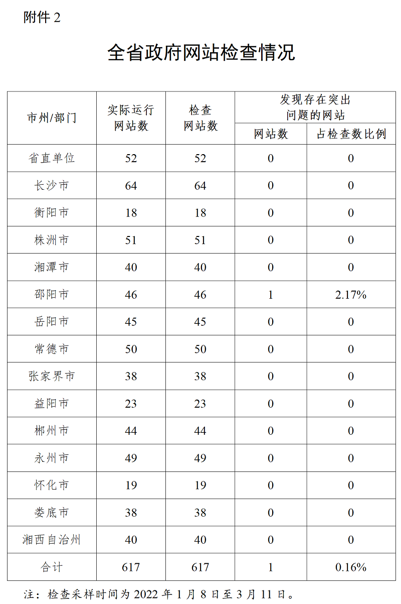 2022年第一季度,省政務局組織對全省正常運行的617家政府網(wǎng)站進行全覆蓋檢查,發(fā)現(xiàn)1家存在單項否決問題,總體合格率99.84%。重點檢查了全省136家政府門戶網(wǎng)站互動交流功能,共有61家政府門戶網(wǎng)站實現(xiàn)對簡單常見咨詢問題1個工作日內(nèi)準確答復(詳見附件1)。對全省正常運行的2420家政務新媒體進行普查,發(fā)現(xiàn)6家存在突出問題,總體合格率99.75%。長沙市、株洲市、湘潭市、常德市、益陽市、郴州市、永州市、懷化市、婁底市、湘西自治州政府網(wǎng)站和政務新媒體檢查合格率均達到100%。