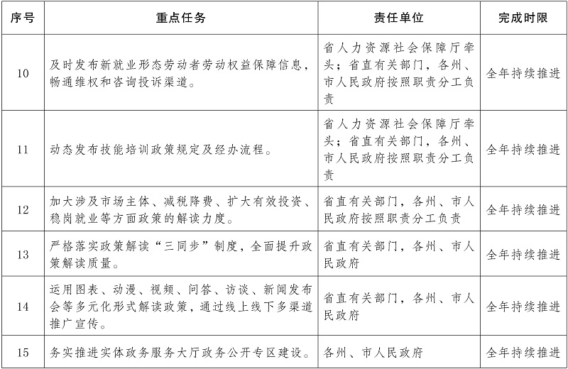 ?。ǘ┩怀鲎龊梅€(wěn)就業(yè)保就業(yè)信息公開(kāi)。著力支持市場(chǎng)主體穩(wěn)崗,加大失業(yè)保險(xiǎn)穩(wěn)崗返還、留工補(bǔ)助、留工培訓(xùn)等政策發(fā)布解讀和政策培訓(xùn)工作力度,重點(diǎn)對(duì)基層執(zhí)行機(jī)關(guān)開(kāi)展政策培訓(xùn),使有關(guān)政策能夠落得快、落得準(zhǔn)、落得實(shí)。深入推進(jìn)面向高校畢業(yè)生、退役軍人、失業(yè)人員等重點(diǎn)群體的就業(yè)服務(wù)信息和促進(jìn)就業(yè)創(chuàng)業(yè)政策措施公開(kāi)。及時(shí)發(fā)布新就業(yè)形態(tài)勞動(dòng)者勞動(dòng)權(quán)益保障信息,暢通維權(quán)和咨詢投訴渠道。動(dòng)態(tài)發(fā)布技能培訓(xùn)政策規(guī)定及經(jīng)辦流程,讓更多群眾能夠知悉,并獲得就業(yè)培訓(xùn)機(jī)會(huì)。(省人力資源社會(huì)保障廳、省教育廳、省退役軍人廳牽頭;省直有關(guān)部門,各州、市人民政府按照職責(zé)分工負(fù)責(zé))