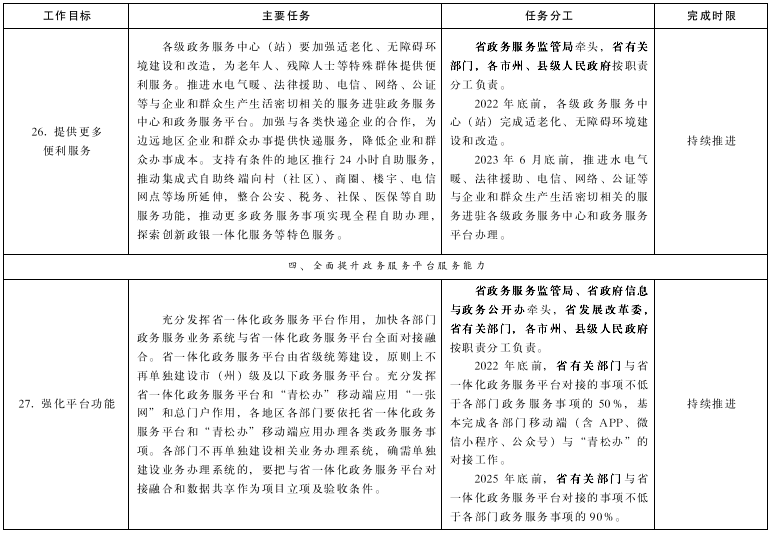 2022年底前,省、市(州)、縣(市、區(qū)、行委)、鄉(xiāng)鎮(zhèn)(街道)、村(社區(qū))五級政務(wù)服務(wù)能力和水平顯著提升,建立全省政務(wù)服務(wù)事項基本目錄清單并進行動態(tài)管理,各級政務(wù)服務(wù)中心規(guī)范、高效運行,綜合服務(wù)窗口全覆蓋,為企業(yè)和群眾辦事提供全省統(tǒng)一的一體化政務(wù)服務(wù)平臺總門戶,“一網(wǎng)通辦”服務(wù)能力顯著提升,企業(yè)和群眾經(jīng)常辦理的政務(wù)服務(wù)事項實現(xiàn)“跨省通辦”;2025年底前,全省政務(wù)服務(wù)標準化、規(guī)范化、便利化水平大幅提升,省一體化政務(wù)服務(wù)平臺服務(wù)能力全面提升,“網(wǎng)上辦、掌上辦、就近辦、一次辦”更加好辦易辦,政務(wù)服務(wù)線上線下深度融合、協(xié)調(diào)發(fā)展,高頻電子證照實現(xiàn)全省互通互認,高頻政務(wù)服務(wù)事項實現(xiàn)全省無差別受理、同標準辦理,“免證辦”全面推行,全面打響政務(wù)服務(wù)“青松辦”品牌。