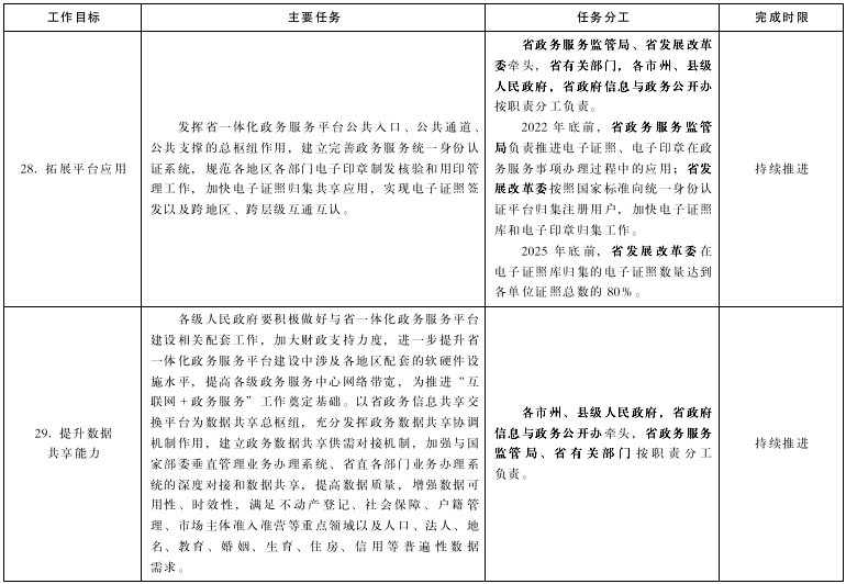 28.拓展平臺應(yīng)用。發(fā)揮省一體化政務(wù)服務(wù)平臺公共入口、公共通道、公共支撐的總樞紐作用,建立完善政務(wù)服務(wù)統(tǒng)一身份認證系統(tǒng),規(guī)范各地區(qū)各部門電子印章制發(fā)核驗和用印管理工作,加快電子證照歸集共享應(yīng)用,實現(xiàn)電子證照簽發(fā)以及跨地區(qū)、跨層級互通互認。(牽頭單位:省政務(wù)服務(wù)監(jiān)管局、省發(fā)展改革委;責任單位:省有關(guān)部門,各市州、縣級人民政府,省政府信息與政務(wù)公開辦;完成時限:持續(xù)推進)
