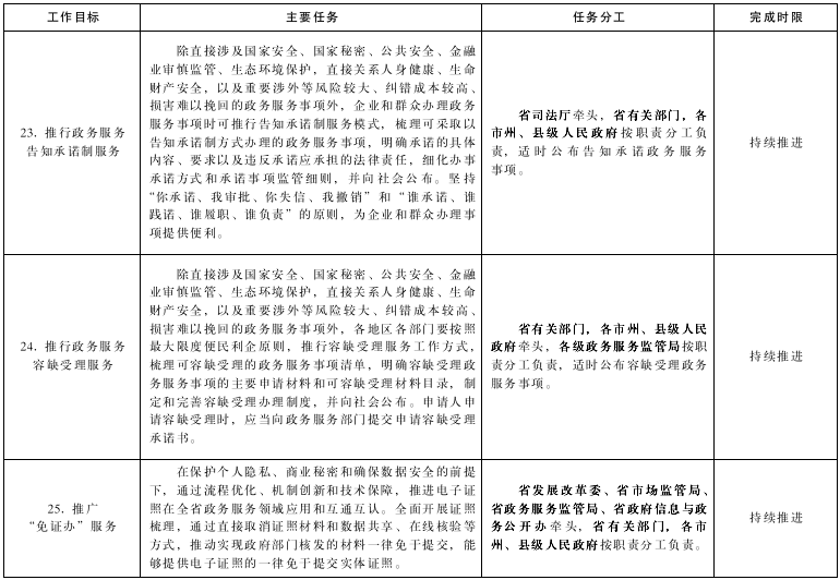23.推行政務(wù)服務(wù)告知承諾制服務(wù)。除直接涉及國家安全、國家秘密、公共安全、金融業(yè)審慎監(jiān)管、生態(tài)環(huán)境保護,直接關(guān)系人身健康、生命財產(chǎn)安全,以及重要涉外等風險較大、糾錯成本較高、損害難以挽回的政務(wù)服務(wù)事項外,企業(yè)和群眾辦理政務(wù)服務(wù)事項時可推行告知承諾制服務(wù)模式,梳理可采取以告知承諾制方式辦理的政務(wù)服務(wù)事項,明確承諾的具體內(nèi)容、要求以及違反承諾應(yīng)承擔的法律責任,細化辦事承諾方式和承諾事項監(jiān)管細則,并向社會公布。堅持“你承諾、我審批、你失信、我撤銷”和“誰承諾、誰踐諾、誰履職、誰負責”的原則,為企業(yè)和群眾辦理事項提供便利。(牽頭單位:省司法廳;責任單位:省有關(guān)部門,各市州、縣級人民政府;完成時限:持續(xù)推進)