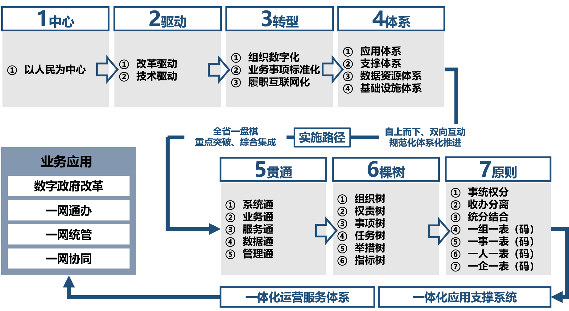 3步轉(zhuǎn)型——政府組織數(shù)字化轉(zhuǎn)型、業(yè)務(wù)事項(xiàng)標(biāo)準(zhǔn)化協(xié)同化轉(zhuǎn)型、履職方式智能化轉(zhuǎn)型。第一步,數(shù)字政府建設(shè)以政府組織數(shù)字化轉(zhuǎn)型為先導(dǎo),實(shí)現(xiàn)組織架構(gòu)、組織權(quán)責(zé)、業(yè)務(wù)事項(xiàng)、工作任務(wù)及考核指標(biāo)數(shù)字化。第二步,在政府組織數(shù)字化轉(zhuǎn)型的基礎(chǔ)上,實(shí)施業(yè)務(wù)事項(xiàng)標(biāo)準(zhǔn)化協(xié)同化轉(zhuǎn)型,實(shí)現(xiàn)一網(wǎng)通辦、一網(wǎng)統(tǒng)管、服務(wù)體驗(yàn)一致化。第三步,通過事項(xiàng)辦理、任務(wù)執(zhí)行流程化,規(guī)則配置數(shù)字化,數(shù)據(jù)資源一體化,業(yè)務(wù)事項(xiàng)微服務(wù)化,建立一體化政務(wù)應(yīng)用體系,實(shí)現(xiàn)政府履職、群眾辦理雙在線,推動政府履職方式智能化轉(zhuǎn)型。