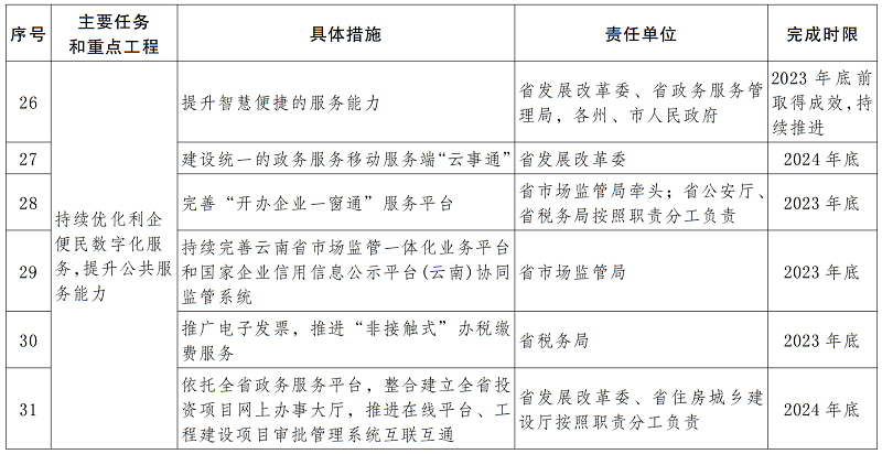 提供優(yōu)質(zhì)便利的涉企服務(wù)。完善“開辦企業(yè)一窗通”服務(wù)平臺,實現(xiàn)企業(yè)注冊、刻章、申領(lǐng)發(fā)票、備案信息補(bǔ)充采集等一站式服務(wù)。持續(xù)完善云南省市場監(jiān)管一體化業(yè)務(wù)平臺和國家企業(yè)信用信息公示平臺(云南)協(xié)同監(jiān)管系統(tǒng),助推“證照分離”改革不斷深入,探索應(yīng)用數(shù)字技術(shù)支撐“一業(yè)一證”改革。推廣電子發(fā)票,推進(jìn)“非接觸式”辦稅繳費(fèi)服務(wù)。依托全省政務(wù)服務(wù)平臺,整合建立全省投資項目網(wǎng)上辦事大廳,推進(jìn)投資項目在線審批監(jiān)管平臺、工程建設(shè)項目審批管理系統(tǒng)互聯(lián)互通,提升項目審批效率。構(gòu)建中小企業(yè)融資綜合信用服務(wù)平臺,通過共享全國企業(yè)融資信用信息和信用服務(wù),面向中小微企業(yè)提供信用類融資服務(wù)。建設(shè)惠企政策項目申報系統(tǒng),提供“一企一碼”個性化數(shù)字名片,實現(xiàn)“亮碼辦事”,優(yōu)化業(yè)務(wù)辦理模式。開展涉企政策“一站式”網(wǎng)上發(fā)布,開展跨境貿(mào)易、納稅、獲得電力等主題服務(wù)。