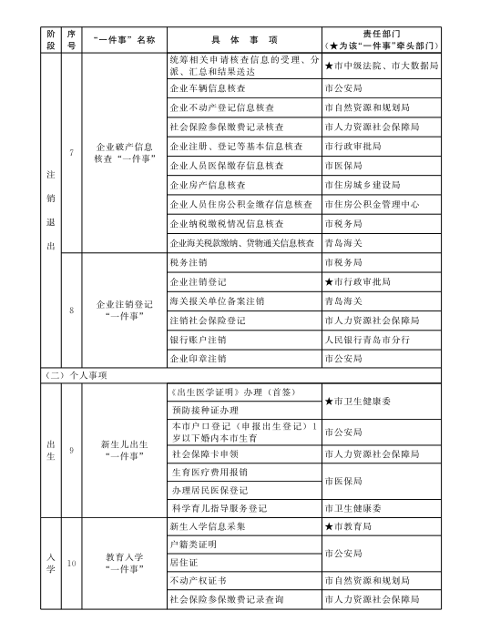?。ǘ┥罨辗漳J絼?chuàng)新。推進關(guān)聯(lián)事項集成辦,全面落實國務院首批“高效辦成一件事”重點事項,高質(zhì)量完成企業(yè)注銷登記、教育入學、殘疾人服務3個國家確定創(chuàng)新示范“一件事”,逐個建立“一個牽頭部門、一個工作團隊、一套工作方案”運行機制。(責任單位:市委金融辦、市中級法院、市發(fā)展改革委、市教育局、市人力資源社會保障局、市交通運輸局、市衛(wèi)生健康委、市大數(shù)據(jù)局、市行政審批局、市殘聯(lián))鼓勵各區(qū)(市)各部門從實際出發(fā)改革創(chuàng)新、大膽探索,不斷拓展新的服務場景,推出具有青島特色的“一件事”。推進容缺事項承諾辦,以政務服務部門清楚告知、企業(yè)和群眾誠信守諾為基礎,對風險可控、糾錯成本低且能夠通過事中事后監(jiān)管有效防范風險的政務服務事項,推行“告知承諾+容缺辦理”審批服務模式。(責任單位:各政務服務部門)持續(xù)落實政務服務事項省內(nèi)通辦、跨省通辦,依托線下代收代辦服務模式,按需開設遠程虛擬窗口,做到就近辦、異地辦。(責任單位:市行政審批局、市大數(shù)據(jù)局)