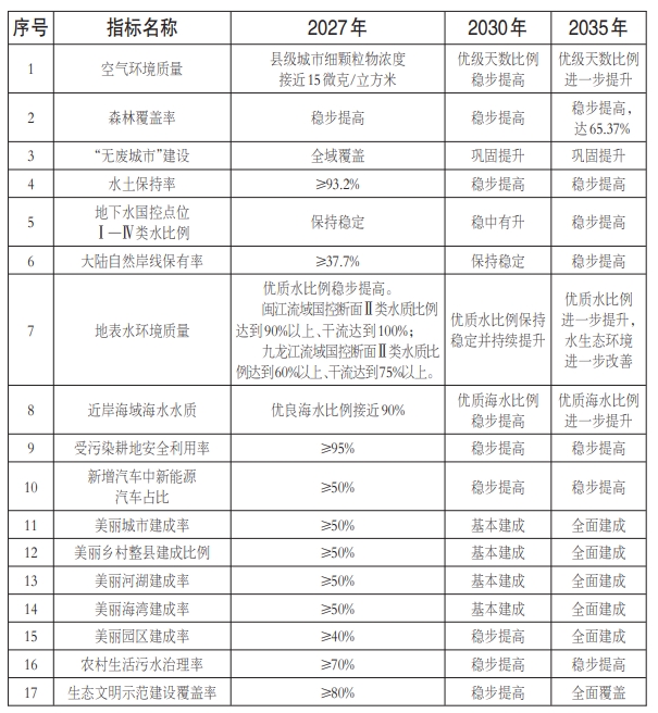 到2027年,生態(tài)環(huán)境質(zhì)量持續(xù)提升,國土空間開發(fā)保護格局得到優(yōu)化,生態(tài)系統(tǒng)服務(wù)功能不斷加強,優(yōu)質(zhì)生態(tài)產(chǎn)品有效供給,城鄉(xiāng)人居環(huán)境明顯改善,美好生活品質(zhì)大幅提升,生態(tài)環(huán)境治理體系更加健全,美麗福建建設(shè)成效顯著。