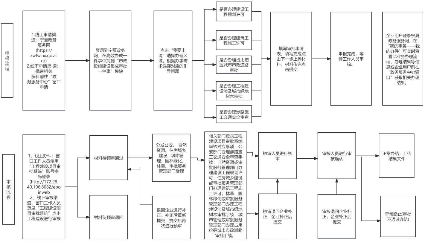 ?。ㄋ模﹨f(xié)同集成審核。建設(shè)單位通過(guò)線上或線下提交材料后,由綜合窗口統(tǒng)一收件,通過(guò)寧夏工程建設(shè)項(xiàng)目審批管理系統(tǒng)分發(fā)至公安、自然資源、住房城鄉(xiāng)建設(shè)、城市管理、園林綠化、林草等部門(mén)辦理,實(shí)現(xiàn)市政設(shè)施建設(shè)手續(xù)全流程“一網(wǎng)通辦”。審核通過(guò)后,公安部門(mén)出具涉路施工交通安全審查手續(xù);自然資源或?qū)徟?wù)管理部門(mén)出具建設(shè)工程規(guī)劃許可證;住房城鄉(xiāng)建設(shè)部門(mén)或?qū)徟?wù)管理部門(mén)出具建筑工程施工許可證;城市管理部門(mén)、住房城鄉(xiāng)建設(shè)部門(mén)或?qū)徟?wù)管理部門(mén)出具占用挖掘城市市政道路審批手續(xù);林草、園林綠化或?qū)徟?wù)管理部門(mén)出具工程建設(shè)涉及城市綠地樹(shù)木審批意見(jiàn)書(shū)或建設(shè)項(xiàng)目占用林地、草地審核同意書(shū)。寧夏工程建設(shè)項(xiàng)目審批管理系統(tǒng)自動(dòng)進(jìn)行結(jié)果歸集。(自治區(qū)住房城鄉(xiāng)建設(shè)廳牽頭,自治區(qū)公安廳、自然資源廳、林業(yè)和草原局按職責(zé)分工負(fù)責(zé);完成時(shí)限:2026年4月底前)