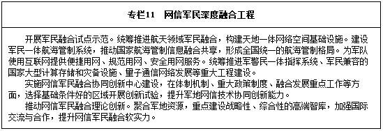 推進(jìn)信息基礎(chǔ)設(shè)施共建共用共享。統(tǒng)籌軍地信息傳輸網(wǎng)絡(luò)建設(shè),構(gòu)建軍民共用的國家光纜網(wǎng)。深化天基通信系統(tǒng)融合發(fā)展,加快推動軍民共用全球移動通信衛(wèi)星系統(tǒng)建設(shè)。推進(jìn)電磁頻譜管理專項(xiàng)工程建設(shè),構(gòu)建軍民協(xié)同合作的電磁頻譜監(jiān)測、檢測和探測網(wǎng)系。加強(qiáng)軍民共用信息系統(tǒng)建設(shè),鼓勵軍隊(duì)以購買、外包等方式從市場獲取高質(zhì)量、低成本的信息產(chǎn)品,充分挖掘利用民間優(yōu)勢數(shù)據(jù)資源和數(shù)據(jù)開發(fā)能力。實(shí)施軍民融合信息資源開發(fā)利用工程,完善安全可靠的軍地信息資源共享交換平臺,規(guī)范軍事信息資源向社會開放,探索利用企業(yè)互聯(lián)網(wǎng)平臺和社會科技資源為軍隊(duì)服務(wù)。加強(qiáng)國防科技工業(yè)綜合管理信息化建設(shè)。