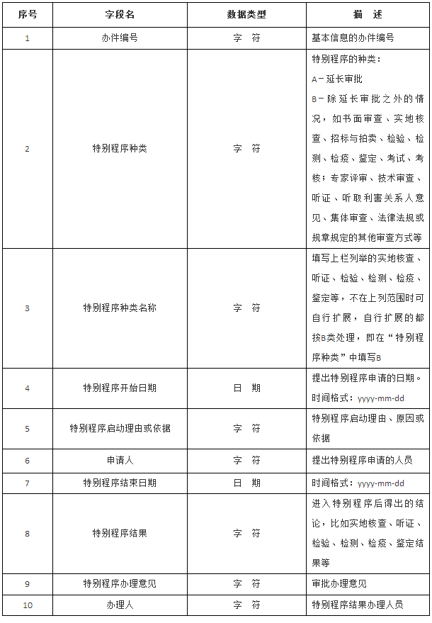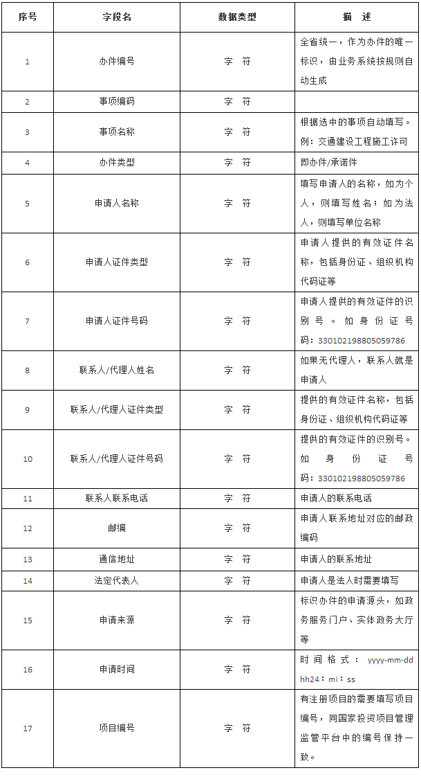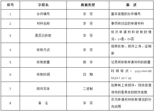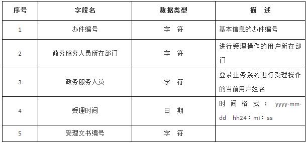 政務(wù)服務(wù)運(yùn)行信息(具體見附錄三)包括申請(qǐng)信息、申請(qǐng)材料信息、受理信息、辦理環(huán)節(jié)信息、特別程序信息、辦結(jié)信息。