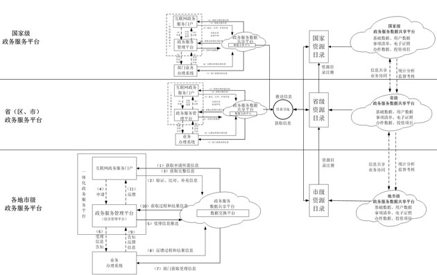 “互聯(lián)網(wǎng)+政務(wù)服務(wù)”平臺(tái)總體層級(jí)架構(gòu)和信息流架構(gòu)示意圖
