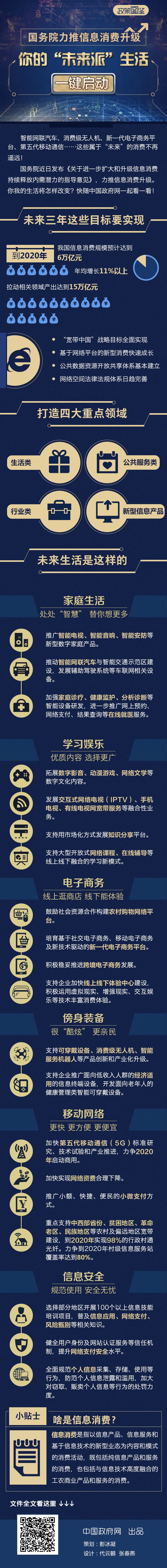 國務院近日發(fā)布《關于進一步擴大和升級信息消費持續(xù)釋放內需潛力的指導意見》,力推信息消費升級。你我的生活將怎樣改變?快隨中國政府網一起看一看!