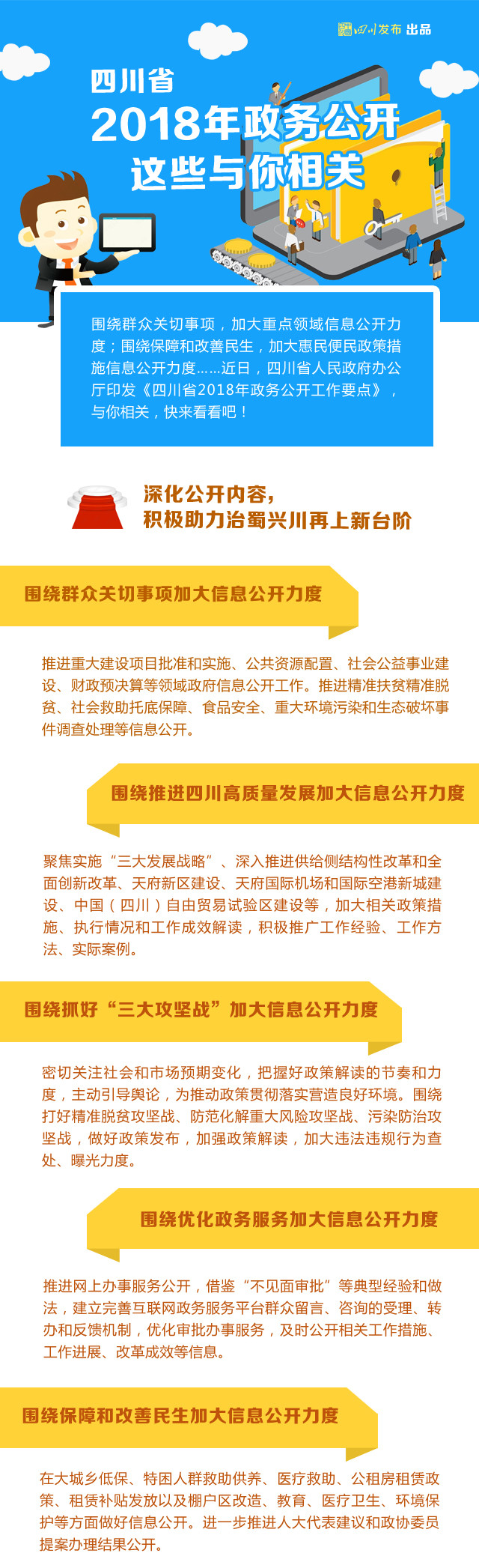如何讓政府工作公開(kāi)透明,讓政務(wù)信息傳達(dá)給有需要的辦事群眾?做好政務(wù)公開(kāi)工作是突破口。近日,省政府辦公廳印發(fā)《四川省2018年政務(wù)公開(kāi)工作要點(diǎn)》((簡(jiǎn)稱《工作要點(diǎn)》)),今年四川將從深化公開(kāi)內(nèi)容、完善公開(kāi)程序、豐富公開(kāi)方式、強(qiáng)化試點(diǎn)引領(lǐng)四個(gè)大方面來(lái)對(duì)政務(wù)公開(kāi)工作再“升級(jí)”。