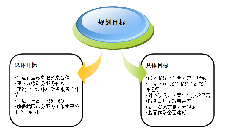 為提高我區(qū)政務(wù)服務(wù)水平,我區(qū)十三五規(guī)劃的總體目標(biāo)是從自治區(qū)、市、縣(市、區(qū))到鄉(xiāng)鎮(zhèn)(街道)、村(社區(qū))村(社區(qū))五個不同級別的行政區(qū)劃入手,建設(shè)和完善“高標(biāo)準、高品質(zhì)、高效能”的“互聯(lián)網(wǎng)+政務(wù)服務(wù)”體系,其功能包括政務(wù)公開、行政審批、公共服務(wù)等綜合服務(wù)。此總體目標(biāo)的制定主要參照我區(qū)行政區(qū)域五級劃分和政務(wù)服務(wù)工作惠民需全面的實際情況,和此目標(biāo)實踐并達成預(yù)期成效的可能性制定,較科學(xué)合理的明確了新時期、“新常態(tài)”下我區(qū)政務(wù)服務(wù)的努力方向和新型政務(wù)服務(wù)體系的提供的新型服務(wù),讓政府工作人員明確新的工作方向、內(nèi)容和工作目標(biāo)。這一總體目標(biāo)符合我區(qū)黨政機關(guān)始終堅持黨全心全意為人民服務(wù)的宗旨,建設(shè)服務(wù)型、創(chuàng)新型政府的理念,真正為人民辦實事和改善民生的決心。