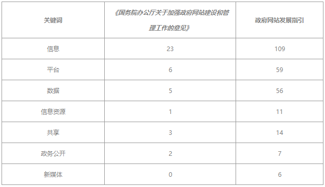 相比于12年前國辦發(fā)布的《關(guān)于加強(qiáng)政府網(wǎng)站建設(shè)和管理工作的意見》,本次發(fā)布的《政府網(wǎng)站發(fā)展指引》中“信息”、“平臺”、“數(shù)據(jù)”三個詞的出現(xiàn)次數(shù)分別提升了5倍和10倍,出現(xiàn)頻次分別為109次、59次和56次,而“新媒體”在12年前出現(xiàn)頻次為0,究其原因主要有三個方面: