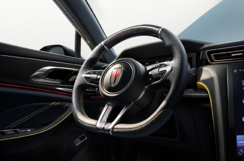 碳纖維加真皮材質(zhì)的平底式方向盤(pán),在釋放腿部空間的同時(shí),也使得視覺(jué)中心上移,讓駕駛者更專(zhuān)注于駕駛。六點(diǎn)鐘位置輻條的紋理設(shè)計(jì),細(xì)節(jié)之處見(jiàn)真章。