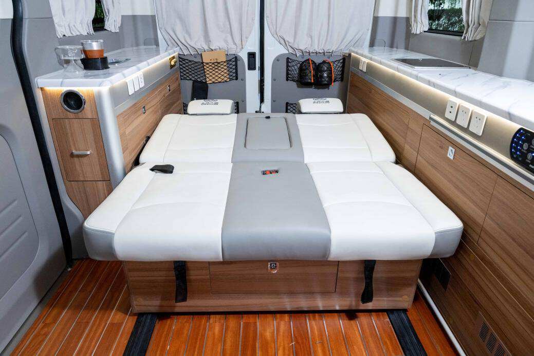到了晚上,將上汽大通MAXUS V90露營版的乘客區(qū)雙人座椅調(diào)節(jié)至90度全傾倒,就變成了一張舒適的臥榻。拉上隱私窗簾、打開小夜燈,在寧靜的夜晚,伴隨著星星點點入睡,第二天再開啟美好旅程。