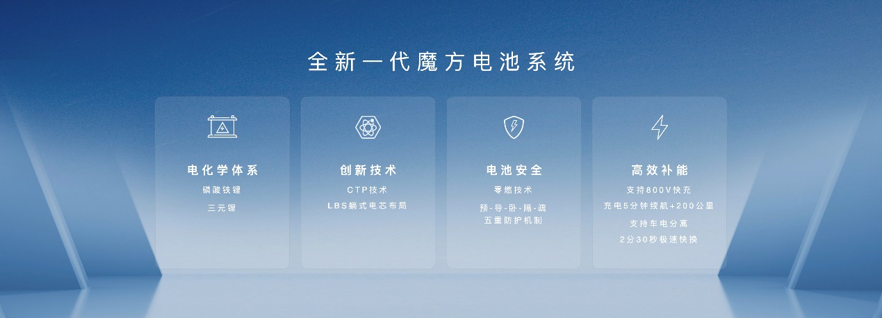 作為行業(yè)領 先的動力儲能解決方案,全新一代魔方電池系統(tǒng)支持磷酸鐵鋰、三元鋰等多種電化學體系。其采用高效安全的CTP技術、創(chuàng)新的LBS躺式電芯布局,還應用零燃技術,通過五重防護機制,為用戶構筑堅固的安全防線。全新一代魔方電池系統(tǒng)還兼容領 先的補能技術,可支持800V快充,充電5分鐘,續(xù)航可增加200公里,還支持最快僅需2分30秒的極速換電。