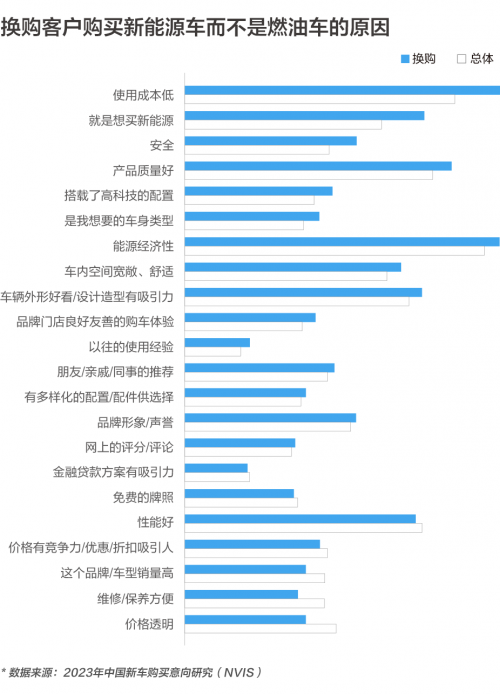 另一個需要重點關(guān)注的群體是換購人群。研究顯示,2023 年,新能源汽車市場中,換購客戶的比重持續(xù)增加,增速快。與首購和增購的消費者相比,換購群體在入店前就已經(jīng)明確自己的購車目標、更看重品牌和產(chǎn)品質(zhì)量。數(shù)據(jù)顯示,換購客戶的平均成交單價更高,具有更強的購車消費力。同時,他們對日常使用成本、安全性和高科技配置都非常關(guān)注。因此,針對換購客戶,經(jīng)銷商可以著重強調(diào)新能源車在使用成本上的優(yōu)勢,突出車輛安全性及智能化相關(guān)配置信息,以增加換購客戶的購買意愿。