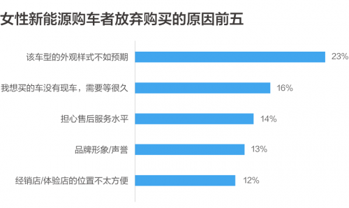 同時,J.D. Power研究還顯示,最考慮購買新能源汽車的女性比例高達39%,而男性這一數(shù)字為30%。如何把握女性客戶的購車心理,值得新能源汽車廠商和經(jīng)銷商共同關(guān)注。在女性新能源購車者決定購買這款車的主要因素中,車輛外觀的顏值更高(31%)、性能更好(31%)、使用成本更低(30%)是女性客戶購車決策的三項重要因素,而放棄購買的首要原因是車型外觀不如預期(23%),可見車輛的外觀設計對于女性客戶購買決策起到了至關(guān)重要的作用。與此同時,沒有現(xiàn)車,新車等待周期較長(16%)、擔憂售后服務水平(14%)也是女性客戶放棄購買的重要因素。