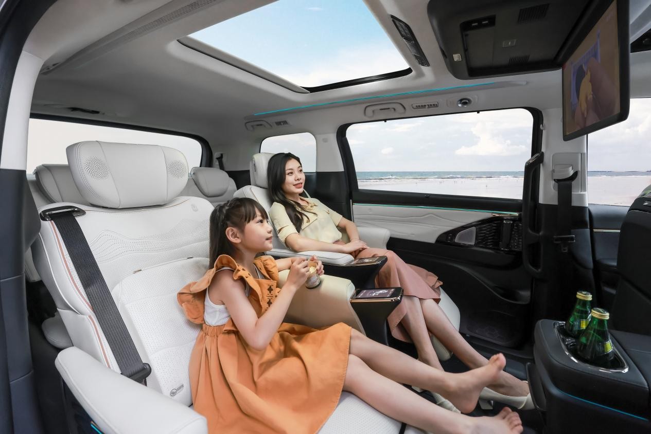 具體來看,E9采用同級獨有半苯胺高級真皮面料,二排豪華頭等艙座椅讓你“一鍵SPA”,釋放旅途中的疲憊,還有二排15.6英寸智慧吸頂屏、12.3英寸副駕娛樂屏等,無論哪個位置都能觀影娛樂,享受旅途中的美好時光。