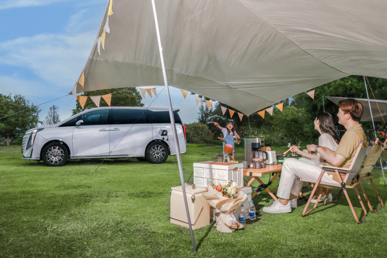 同時,E9還有14度智能保電技術技術,隨時預留,想用就用,即便是在戶外露營時,也可供電磁爐+電飯鍋+落地扇+電燈等同時使用至少4.5個小時,一車解決戶外用電難題。