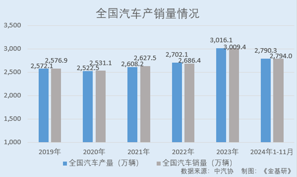 據(jù)中汽協(xié)數(shù)據(jù),2019-2023年,全國汽車產(chǎn)量分別為2,572.1萬輛、2,522.5萬輛、2,608.2萬輛、2,702.1萬輛、3,016.1萬輛;銷量分別為2,576.9萬輛、2,531.1萬輛、2,627.5萬輛、2,686.4萬輛、3,009.4萬輛。2024年1-11月,全國汽車產(chǎn)銷分別完成2,790.3萬輛、2,794萬輛,同比分別增長2.9%、3.7%。