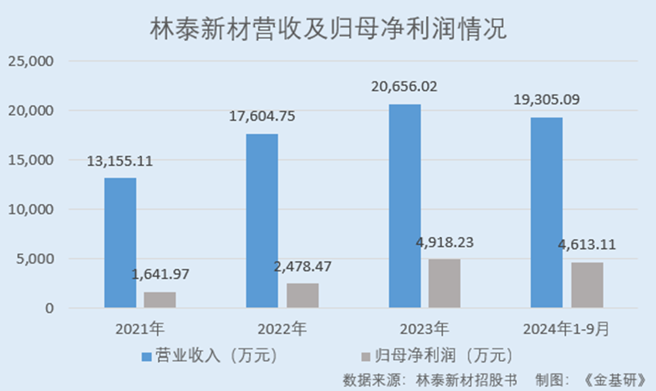 據(jù)招股書,2021-2023年,林泰新材營業(yè)收入分別為1.32億元、1.76億元、2.07億元,年均復(fù)合增長率為25.31%。同期,林泰新材的歸母凈利潤分別為1,641.97萬元、2,478.47萬元、4,918.23萬元,年均復(fù)合增長率達(dá)73.07%。