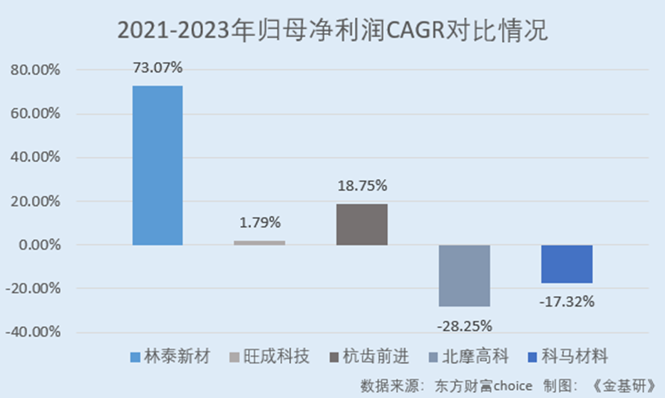 據(jù)東方財(cái)富choice數(shù)據(jù),2021-2023年,林泰新材同行業(yè)可比公司重慶市旺成科技股份有限公司(以下簡(jiǎn)稱“旺成科技”)、杭州前進(jìn)齒輪箱集團(tuán)股份有限公司(以下簡(jiǎn)稱“杭齒前進(jìn)”)、北京北摩高科摩擦材料股份有限公司(以下簡(jiǎn)稱“北摩高科”)、浙江科馬摩擦材料股份有限公司(以下簡(jiǎn)稱“科馬材料”)的營收CAGR分別為-2.99%、-6.21%、-8.21%、-5.49%;歸母凈利潤C(jī)AGR分別為1.79%、18.75%、-28.25%、-17.32%。