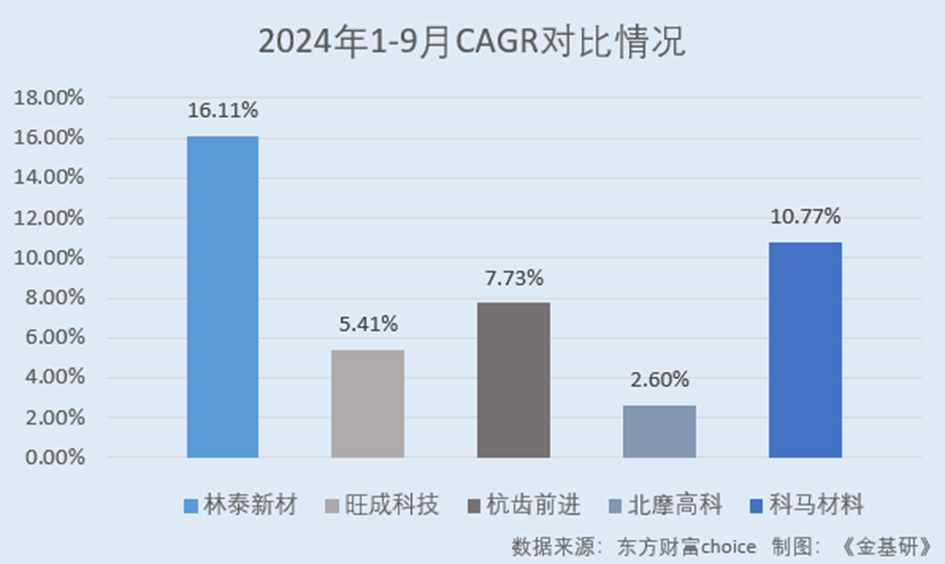 同期,林泰新材的ROE分別為10.03%、12.75%、20.61%、16.11%。其中,2024年1-9月,林泰新材同行業(yè)可比公司旺成科技的ROE為5.41%;杭齒前進(jìn)的ROE為7.73%;北摩高科的ROE為2.60%;科馬材料的ROE為10.77%。