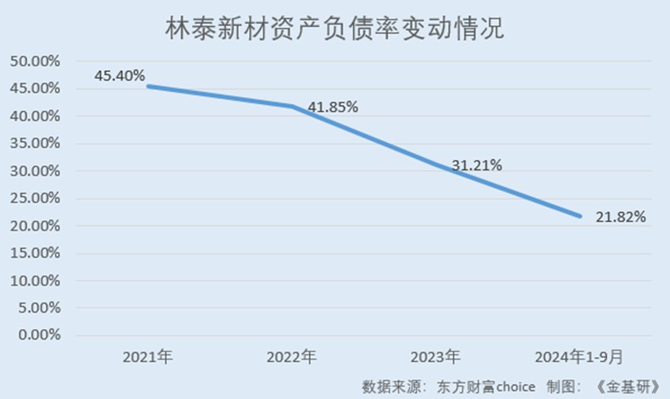 另一方面,近年來林泰新材的資產(chǎn)負(fù)債率呈逐年下降趨勢(shì),償債能力增強(qiáng)。據(jù)東方財(cái)富choice數(shù)據(jù),2021-2023年及2024年1-9月,林泰新材的資產(chǎn)負(fù)債率分別為45.40%、41.85%、31.21%、21.82%。